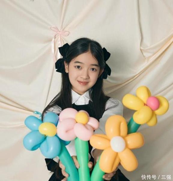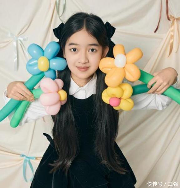 下面这张图里,天天手里捧着一束气球花在拍照,她看着镜头,笑得那叫一个甜,眼睛亮晶晶的特别有神,一看就是个机灵鬼怪的小姑娘。